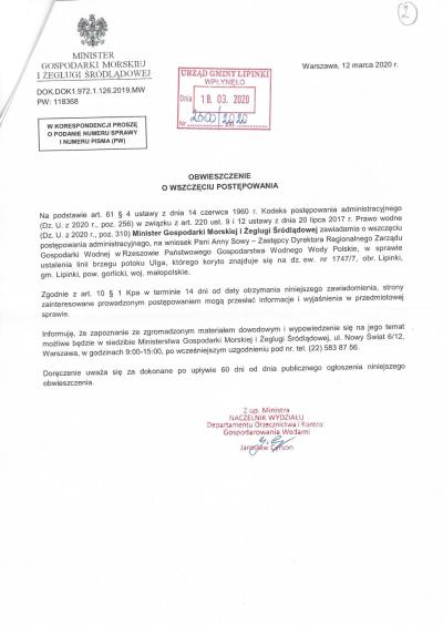 Obwieszczenie dotyczy zawiadomienia o wszczęciu postępowania na wniosek P. Anny Sowy - Z-cy Dyr. Regionalnego Zarządu Gospodarki Wodnej w Rzeszowie Państwowego Gospodarstwa Wodnego Wody Polskie w spr. ustalenia linii brzegu Potoku Ulga , którego koryto znajdują się na terenie Gminy Lipinki.