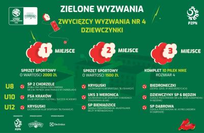 W dniach 5-6 czerwca 2021r reprezentacja naszej szkoły przebywała w Warszawie na zaproszenie PZPN. Wyjazd był główną nagrodą za zdobycie pierwszego miejsca w Ogólnopolskim konkursie na zaprezentowanie treningu piłki nożnej pod nazwą „Zielone Wyzwania”. Konkurs ten miał zastąpić coroczny turniej „ Z podwórka na stadion o Puchar Tymbarku”, który z powodu pandemii nie mógł się odbyć. Reprezentanci naszego klubu sportowego wystartowali w ostatniej edycji--   Zielone Wyzwanie 4, ponieważ wcześniej przebywali na nauczaniu zdalnym. Trener dziewczynek – Magdalena Szewczyk przeprowadziła z uczennicami treningi, a relację z nich, w postaci krótkich filmików, zamieściła na Facebooku zgodnie z wymogami regulaminu. Wystartowaliśmy w trzech kategoriach wiekowych: U-8 do lat ośmiu,    U-10 do lat dziesięciu i U-12 do lat dwunastu.