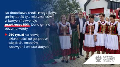 - 250 tys. zł na rozwój działalności kół gospodyń wiejskich, zespołów ludowych i orkiestr dętych;