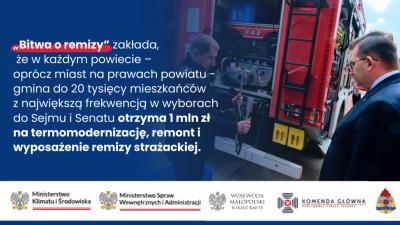 Już wcześniej rząd ogłosił konkurs „Bitwa o remizy”, który zakłada, że w każdym powiecie – oprócz miast na prawach powiatu – gmina do 20 tysięcy mieszkańców z największą frekwencją w wyborach do Sejmu i Senatu otrzyma 1 mln zł na termomodernizację, remont i wyposażenie remizy strażackiej.
