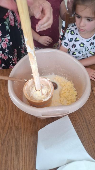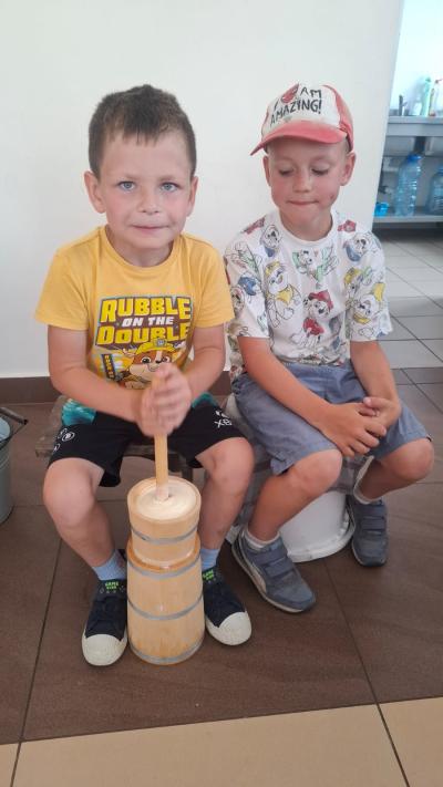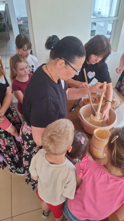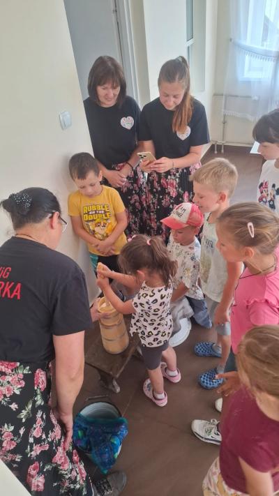 W poniedziałek 7 lipca w Bednarce wszyscy uczestnicy Kreatywnych Wakacji rozpoczęli spacerem na pastwisko, gdzie panie z Koła Gospodyń Wiejskich z Bednarki doiły krowę. Dzieci dowiedziały się w jaki sposób powstaje masło i pod okiem pań z KGW w tradycyjnej maśniczce miały możliwość wyrabiana masła ze śmietany. Swojskie masło i wiejski chleb smakowały wyśmienicie.