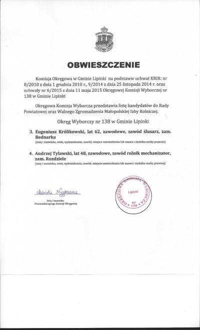 Urząd Gminy Lipinki informuje, iż w roku bieżącym upływa czteroletnia kadencja obecnych organów statutowych izb rolniczych. W związku z tym, na podstawie art. 25 ust.1 ustawy z dnia 14 grudnia 1995 roku o izbach rolniczych (tekst jednolity Dz. U. 2014 poz. 1079) – Krajowa Rada Izb Rolniczych zarządziła przeprowadzenie w całym kraju, w dniu 31 maja 2015 roku, wyborów do Rad Powiatowych Małopolskiej Izby Rolniczej.