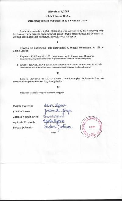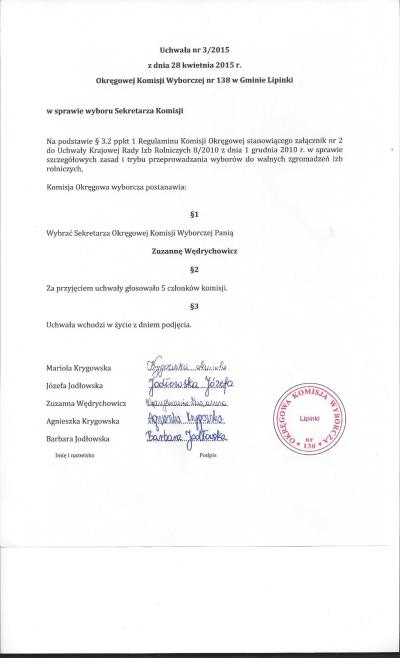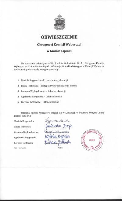 Czytelnie wypełnione dokumenty należy złożyć do dnia 11.05.2015 r., do godz. 15: 00 do Okręgowej Komisji Wyborczej.