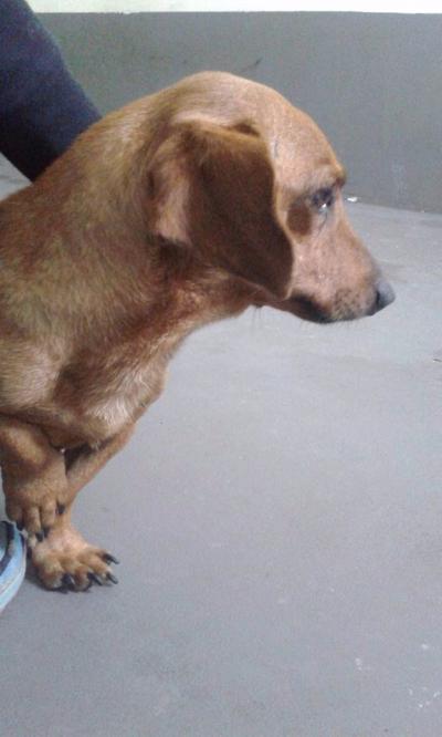 Pies, samiec, krzyżówka w typie jamnika, maść brązowa, wiek ok. 8 lat