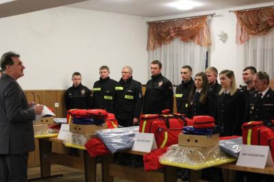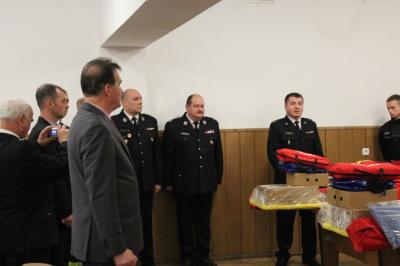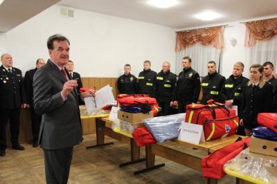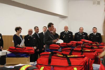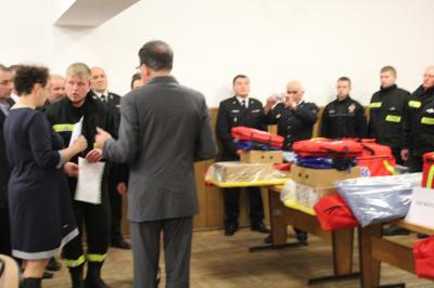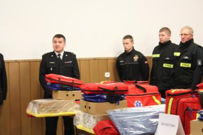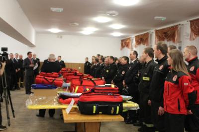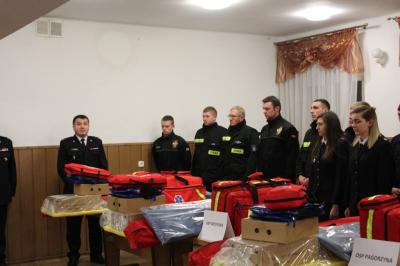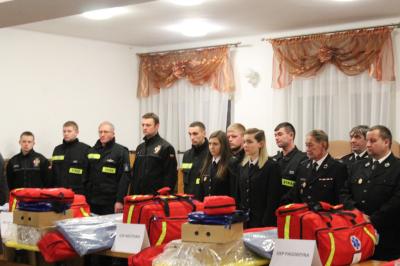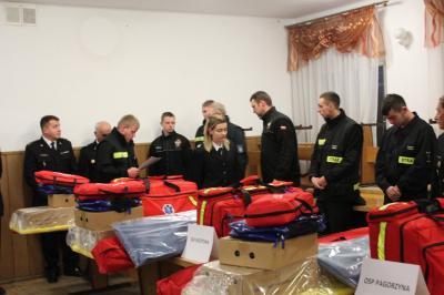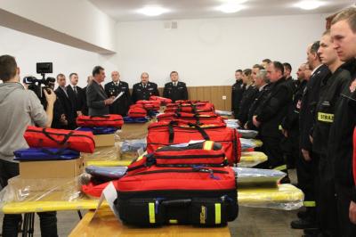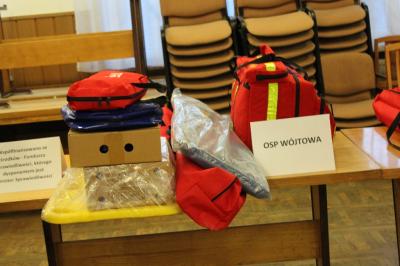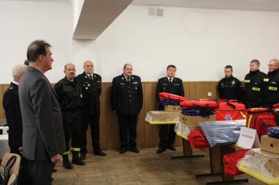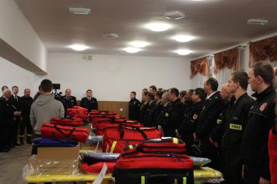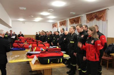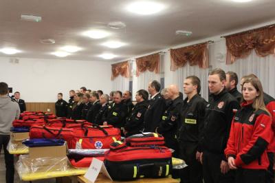 Po powitaniu wszystkich zebranych przez organizatora spotkania odbyło się uroczyste przekazanie sprzętu ratownictwa medycznego dla 6 jednostek Ochotniczych Straży Pożarnych. Wójt Gminy Lipinki podpisał i wręczył na ręce prezesów Ochotniczych Straży Pożarnych, umowy przekazania sprzętu. Wszystkie jednostki OSP otrzymały zestawy ratownictwa medycznego PSP R1 z pełnym wyposażeniem w torbie, z kompletem szyn Kramera, zestawem TRIAGE, hydrożelami, kamizelkami ratowniczymi oraz deską pediatryczną i ortopedyczną.