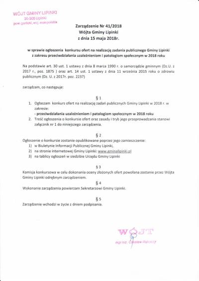 Zarządzenie Nr 41/2018 Wójta Gminy Lipinki w sprawie ogłoszenia konkursu ofert na realizację zadania publicznego Gminy Lipinki z zakresu przeciwdziałania uzależnieniom i patologiom społecznym w 2018 roku