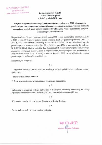 Zarządzenie Wójta Gminy Lipinki w sprawie ogłoszenia otwartego konkursu ofert na realizację w 2019 r zadania publicznego z zakresu pomocy społecznej...