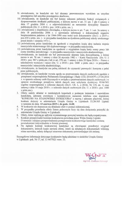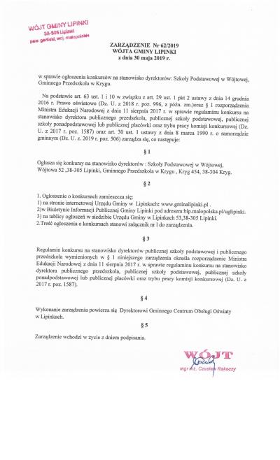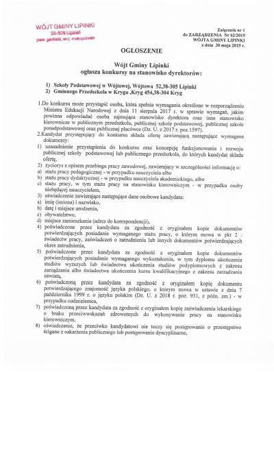 Ogłoszenie konkursów na stanowisko dyrektorów: Szkoły Podstawowej w Wójtowej, Gminnego Przedszkola w Krygu 30.05.2019 13:47 Treść Facebook Twitter Email Drukuj