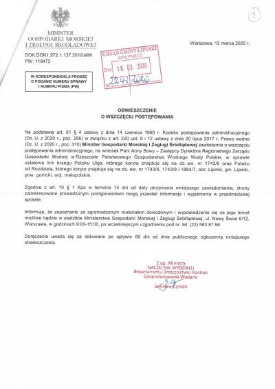 Obwieszczenie dotyczy zawiadomienia o wszczęciu postępowania na wniosek P. Anny Sowy - Z-cy Dyr. Regionalnego Zarządu Gospodarki Wodnej w Rzeszowie Państwowego Gospodarstwa Wodnego Wody Polskie w spr. ustalenia linii brzegu Potoku Ulga oraz Potoku Od Rozdziela, których koryta znajdują się na terenie Gminy Lipinki.