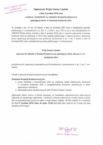 Ogłoszenie o naborze kandydatów na członków Komisji konkursowej opiniującej oferty w otwartym konkursie ofert