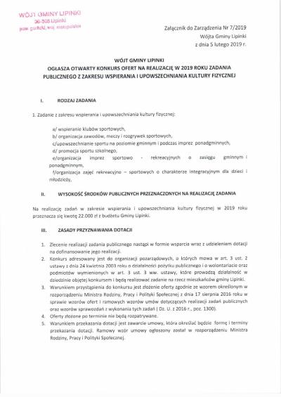Ogłoszenie otwartego konkursu ofert na realizację w 2019 roku zadania publicznego z zakresu wspierania i upowszechniania kultury fizycznej
