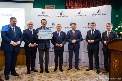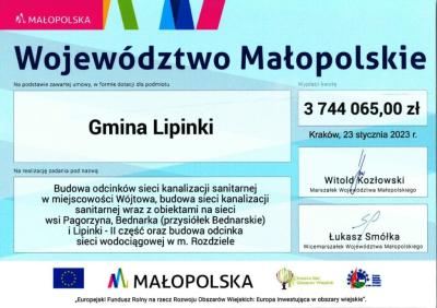 Wójt Gminy Lipinki Czesław Rakoczy w dniu 23 stycznia br. w Nowym Sączu z rąk marszałka Witolda Kozłowskiego odebrał promesę o wartości 3 744 065,00 zł na pomoc finansową dla gospodarki wodno-ściekowej w ramach Programu Rozwoju Obszarów Wiejskich. W wydarzeniu wzięli udział m.in wicemarszałek Józef Gawron, poseł na Sejm RP Patryk Wicher, senator RP Wiktor Durlak, wiceprzewodniczący Sejmiku Województwa Małopolskiego Wojciech Skruch oraz radny Stanisław Pasoń.