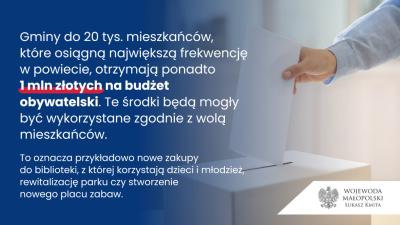 Gminy do 20 tys. mieszkańców, które osiągną największą frekwencję w powiecie, otrzymają ponadto 1 mln złotych na budżet obywatelski. Te środki będą mogły być wykorzystane zgodnie z wolą mieszkańców.