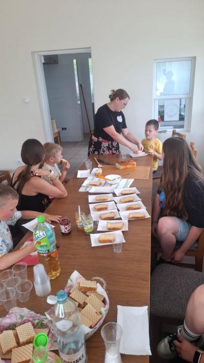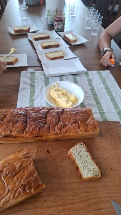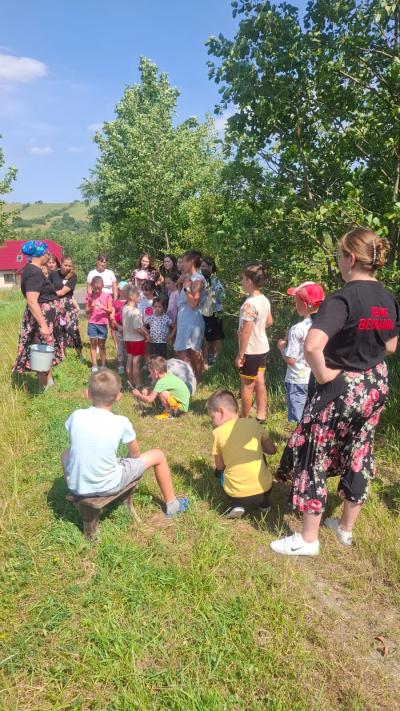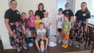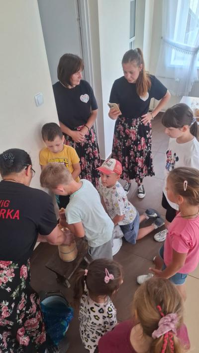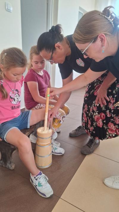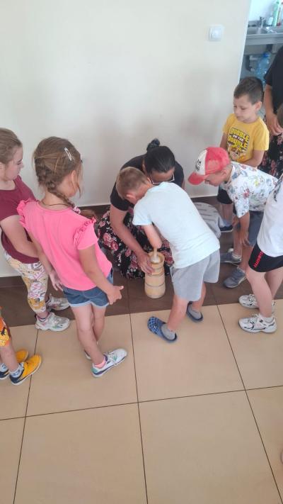 W poniedziałek 7 lipca w Bednarce wszyscy uczestnicy Kreatywnych Wakacji rozpoczęli spacerem na pastwisko, gdzie panie z Koła Gospodyń Wiejskich z Bednarki doiły krowę. Dzieci dowiedziały się w jaki sposób powstaje masło i pod okiem pań z KGW w tradycyjnej maśniczce miały możliwość wyrabiana masła ze śmietany. Swojskie masło i wiejski chleb smakowały wyśmienicie.