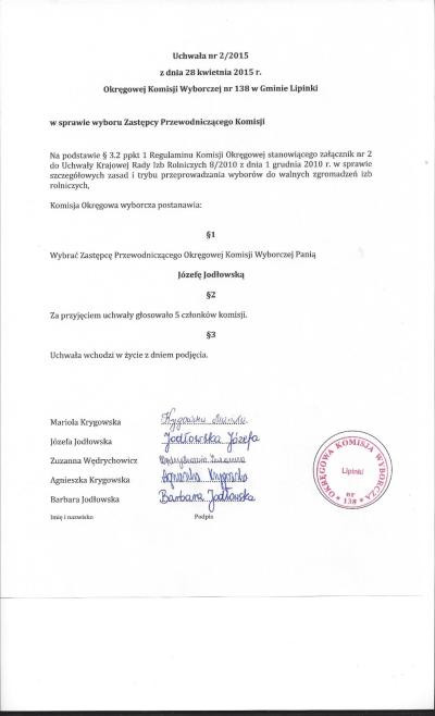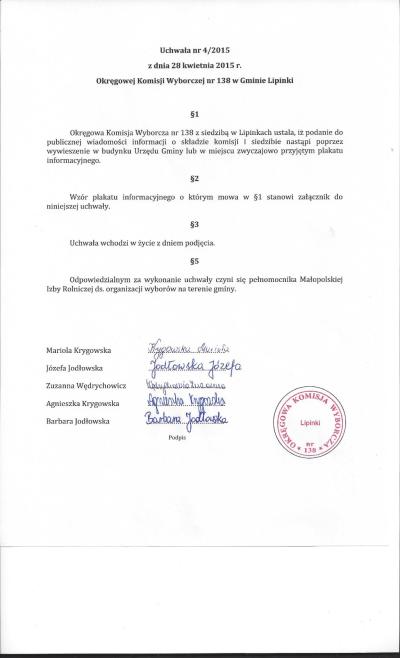 Czytelnie wypełnione dokumenty należy złożyć do dnia 11.05.2015 r., do godz. 15: 00 do Okręgowej Komisji Wyborczej.