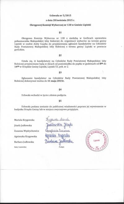Urząd Gminy Lipinki informuje, iż w roku bieżącym upływa czteroletnia kadencja obecnych organów statutowych izb rolniczych. W związku z tym, na podstawie art. 25 ust.1 ustawy z dnia 14 grudnia 1995 roku o izbach rolniczych (tekst jednolity Dz. U. 2014 poz. 1079) – Krajowa Rada Izb Rolniczych zarządziła przeprowadzenie w całym kraju, w dniu 31 maja 2015 roku, wyborów do Rad Powiatowych Małopolskiej Izby Rolniczej.