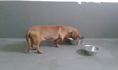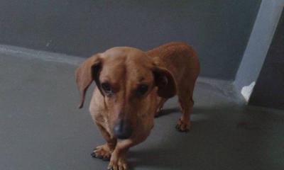 Pies, samiec, krzyżówka w typie jamnika, maść brązowa, wiek ok. 8 lat