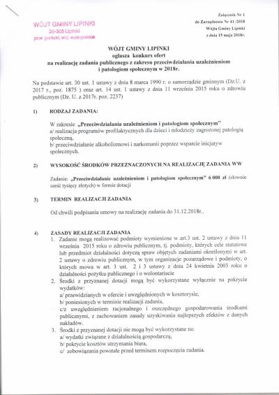 Zarządzenie Nr 41/2018 Wójta Gminy Lipinki w sprawie ogłoszenia konkursu ofert na realizację zadania publicznego Gminy Lipinki z zakresu przeciwdziałania uzależnieniom i patologiom społecznym w 2018 roku