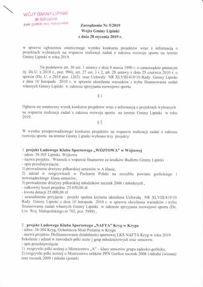 Zarządzenie Wójta Gminy Lipinki w sprawie ogłoszenia ostatecznego wyniku konkursu projektów wraz z informacją o projektach wybranych na wsparcie realizacji zadań z zakresu rozwoju sportu na terenie Gminy Lipinki w roku 2019. 30.01.2019 8:30 Treść Facebook Twitter Email Drukuj