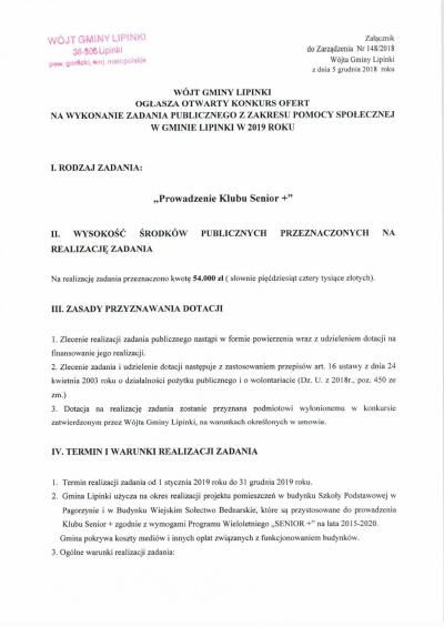 Zarządzenie Wójta Gminy Lipinki w sprawie ogłoszenia otwartego konkursu ofert na realizację w 2019 r zadania publicznego z zakresu pomocy społecznej...