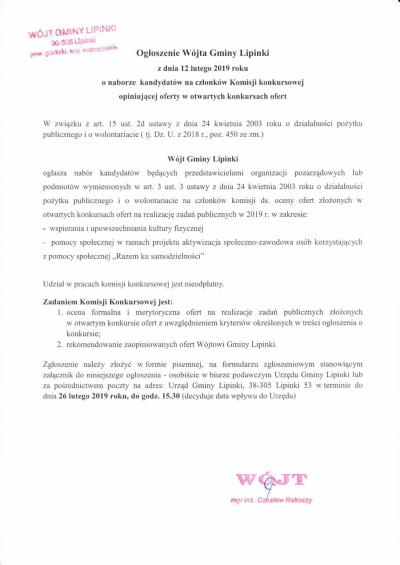 Ogłoszenie Wójta Gminy Lipinki z dnia 12 lutego 2019 roku o naborze kandydatów na członków Komisji konkursowej opiniującej oferty w otwartych konkursach ofert