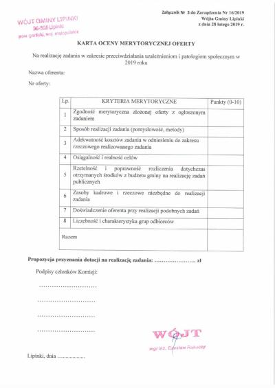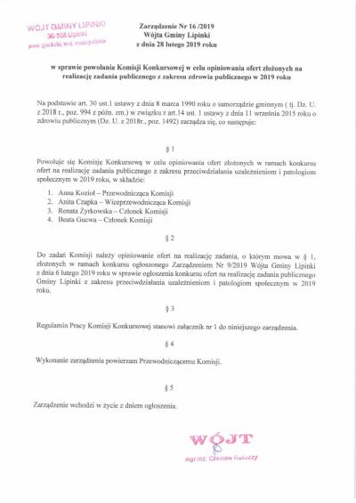 Zarządzenie Nr 16 /2019 Wójta Gminy Lipinki z dnia 28 lutego 2019 roku w sprawie powołania Komisji Konkursowej w celu opiniowania ofert złożonych na realizację zadania publicznego z zakresu zdrowia publicznego w 2019 roku 05.03.2019 12:36 Treść Facebook Twitter Email Drukuj