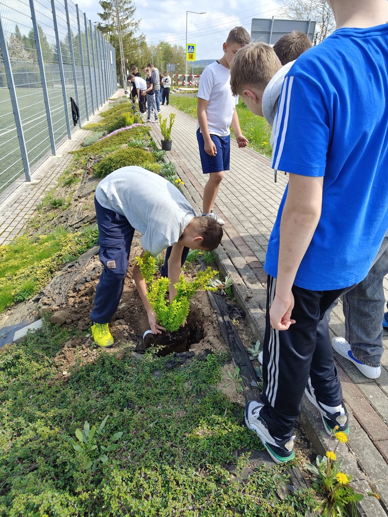 Wspólne sadzenie krzewów było idealnym sposobem na kształtowanie świadomości proekologicznych uczniów.